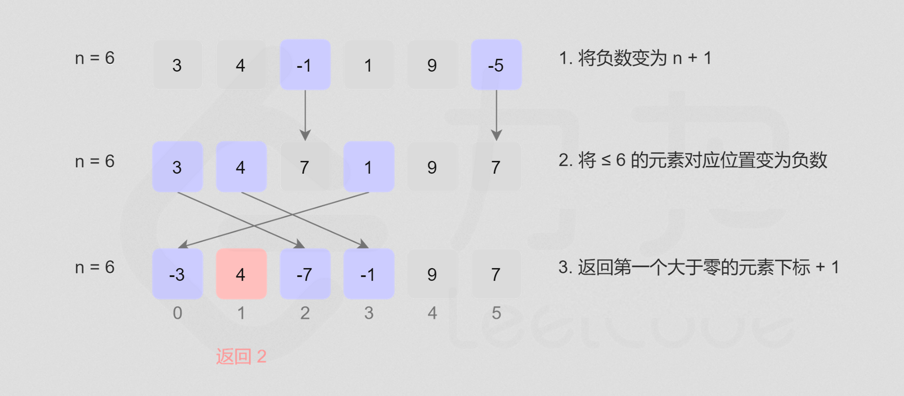 接下来我们思考如何设计“标记”:由于我们只在意 [1,N] 中的数,因此我们可以先对数组进行遍历,把不在 [1,N] 范围内的数修改成任意一个大于 N 的数(例如 N+1)。这样一来,数组中的所有数就都是正数了,因此我们就可以将“标记”表示为「负号」。