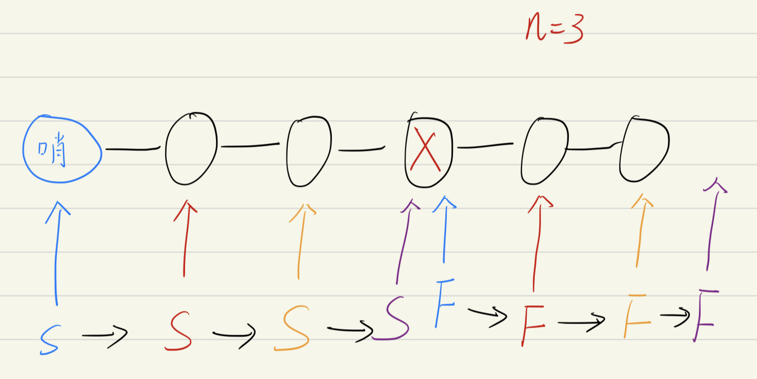 接下来,我们让 fast 先遍历 n 个节点,然后 slow 再开始遍历。